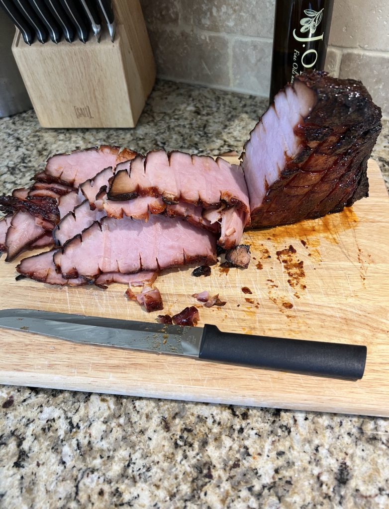 Double Smoked HamThis is a recipe for Simple Double Smoked Ham, involving preparation with Dijon mustard, BBQ rub and sauce.
